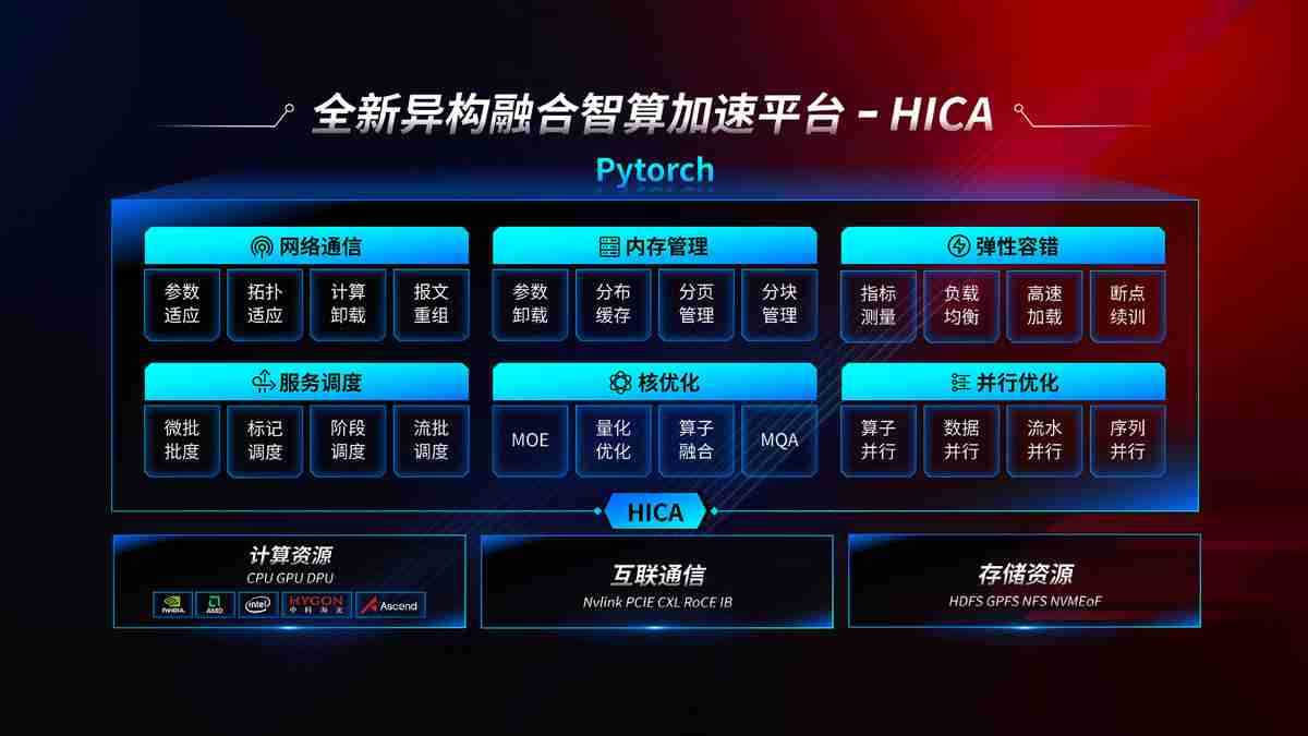 通过自研的服务层、、、、中间适配层、、、以及调度编排算法,,,,采用数据并行、、、模型并行等多种并行方式,,,把并行计算任务进行有效的分解,,,使其分别由相应的软件栈和算力资源来承接。。。当GPU资源变化,,,,HICA可以实时动态调度计算子任务并调整模型拓扑和架构,,以充分聚合各种算力资源。。。